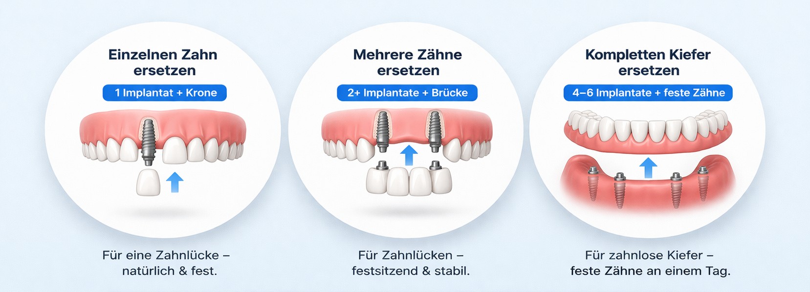 Fehlende Zähne beeinflussen nicht nur das Aussehen, sondern auch Kauen, Sprechen und Lebensqualität. Moderne Implantologie bietet heute für nahezu jede Ausgangssituation eine passende Lösung. Ob einzelner Zahn, mehrere Zähne oder ein kompletter Kiefer – die Versorgung wird individuell geplant. Ziel ist eine stabile, funktionelle und ästhetische Lösung. Welche Option sinnvoll ist, hängt von Ihrer persönlichen Situation ab.
